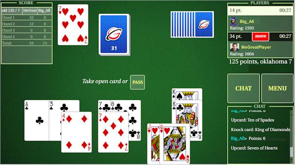 This is a view of a gin rummy game in progress. You are a player in the bottom (with name: MyGreatPlayer) and it is your turn. You can pick up a '7 of Hearts' from an open discard or from a closed deck. Taking a known open card is preferrable here as it would create a meld of three sevens. The chat, the menu etc. are to the right of the gin rummy playing area. There are two ways to move the cards: